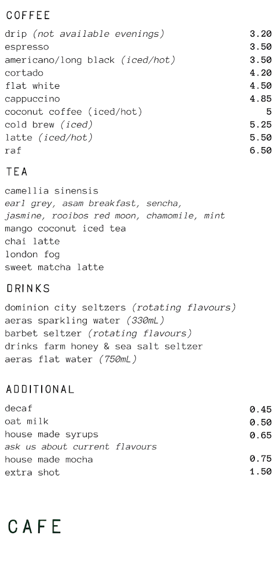 The menu offers a selection of pastries, sandwiches, and beverages suited for breakfast, coffee breaks, and light meals. Pastries are available until sold out or by 4 PM and include items such as cheddar scones, chocolate chip and tahini cookies, blueberry muffins, rotating seasonal loaves, cream slices (dairy-free), raspberry cheesecake bars (gluten-free), and burek available with meat or cheese filling.
